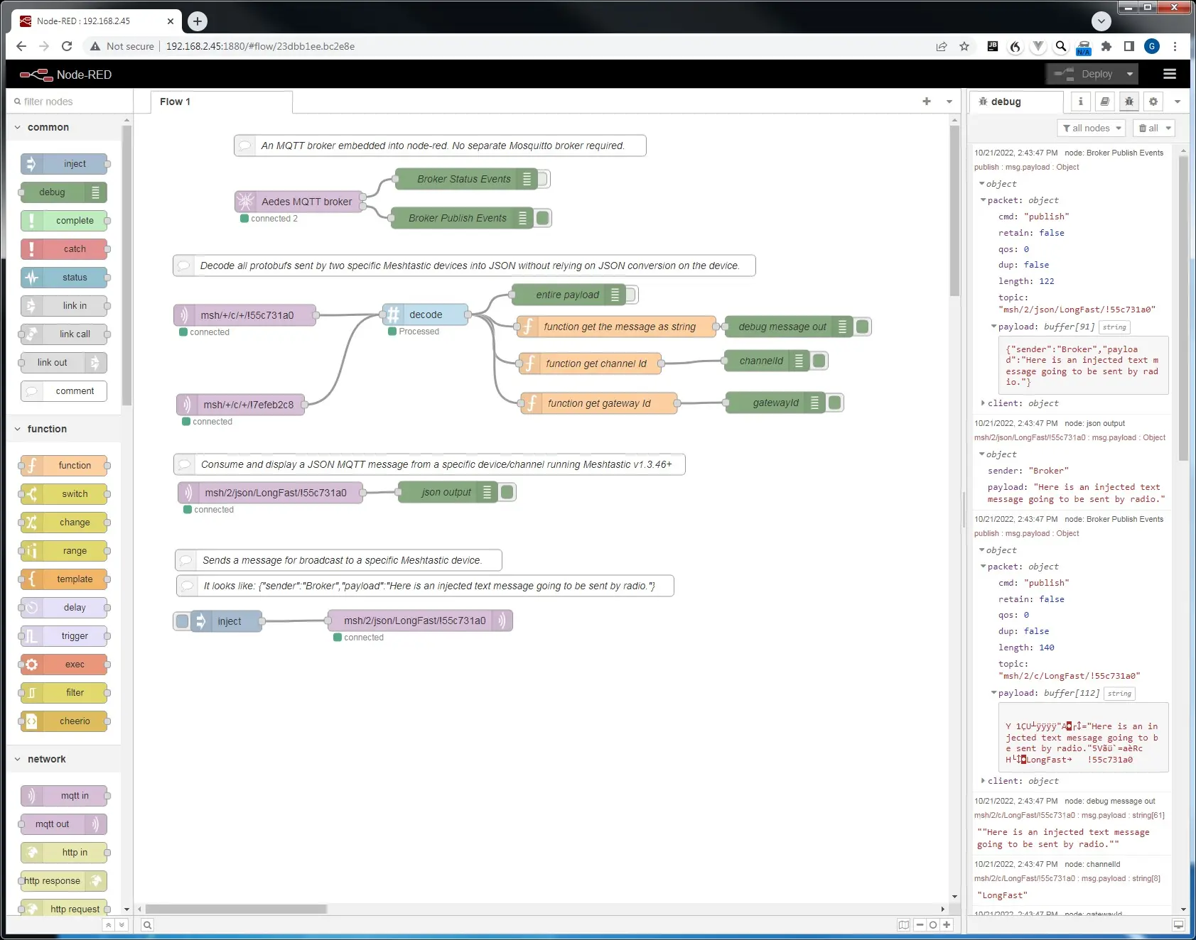 - Использование сообщений, закодированных в protobuf, с узлом декодирования protobuf и определениями protobuf Meshtastic